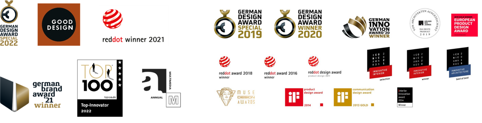 Plus X Award Награда за инновации, дизайн, функциональность и экологичность продукции Red Dot Design Award Признание выдающегося дизайна и инноваций в промышленном дизайне Interior Innovation Award Отличие за инновационные разработки в области интерьерных решений German Design Award Награда за исключительное качество и дизайн продукции, произведённой в Германии Green Good Design Award Признание за экологическое производство и использование экологически чистых материалов